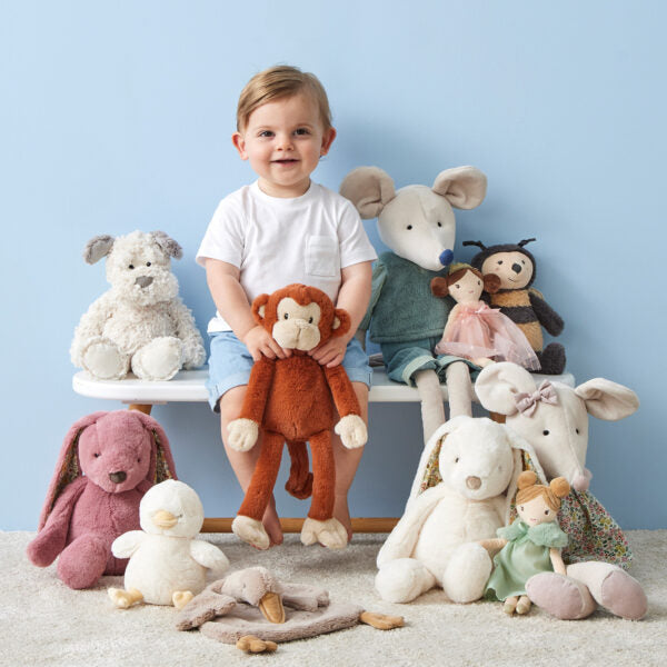 This lovable bunny is the perfect companion for newborns and toddlers! Made from ultra-plush fabric, featuring beautiful floral detailed ears and child-safe trimmings, little ones will love the feel of its irresistibly soft fur, making it great for cuddles. Its beanie bottom will help it sit upright during playtime or when displayed on the shelf. This bunny also loves going on adventures and can be carried around by its floppy ears, which are the perfect size for little hands to hold.